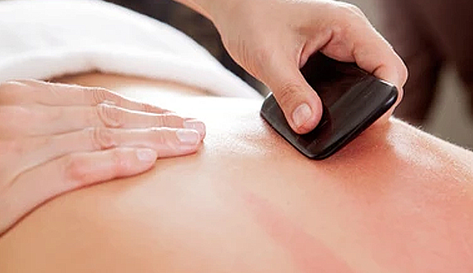 Scraping tool used to break up fascia restrictions and muscle tension, and increase circulation and lymphatic flow to tissue.